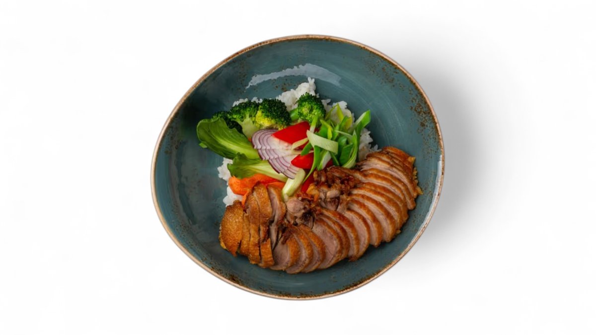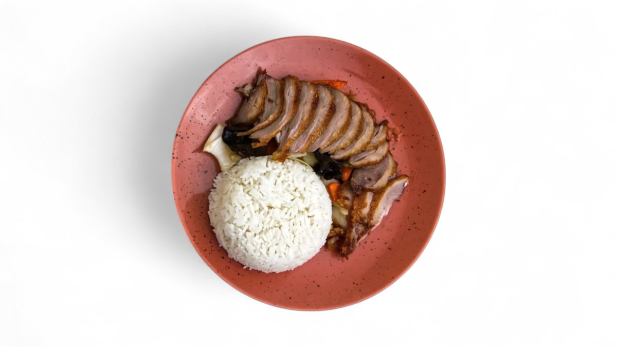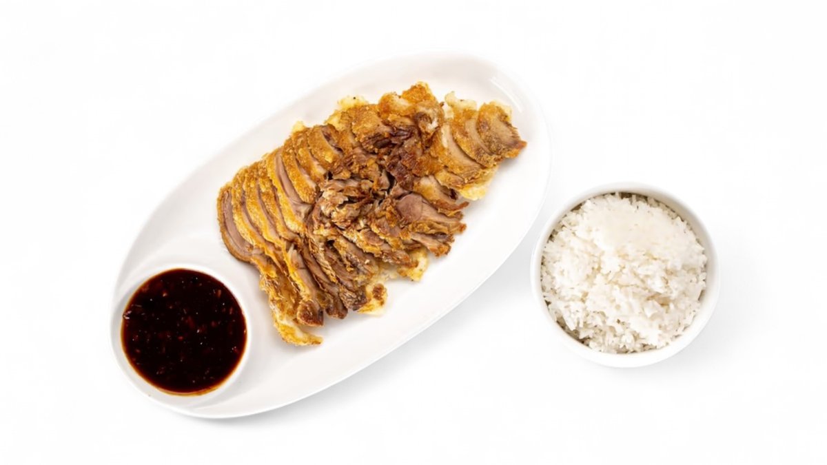 Křupavé kachní maso s jemnou chutí, podávané s vařenou rýži a lehkou omáčkou. Jednoduché, ale velmi oblíbené jídlo. (6.9)