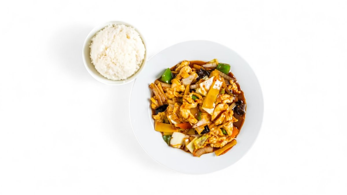 Kachní maso restované s paprikou, cibulí, česnekem a chilli v pikantní sečuánské omáčce, podávané s rýži. Oblíbené jídlo s výraznou chutí a vůní. (6.9)