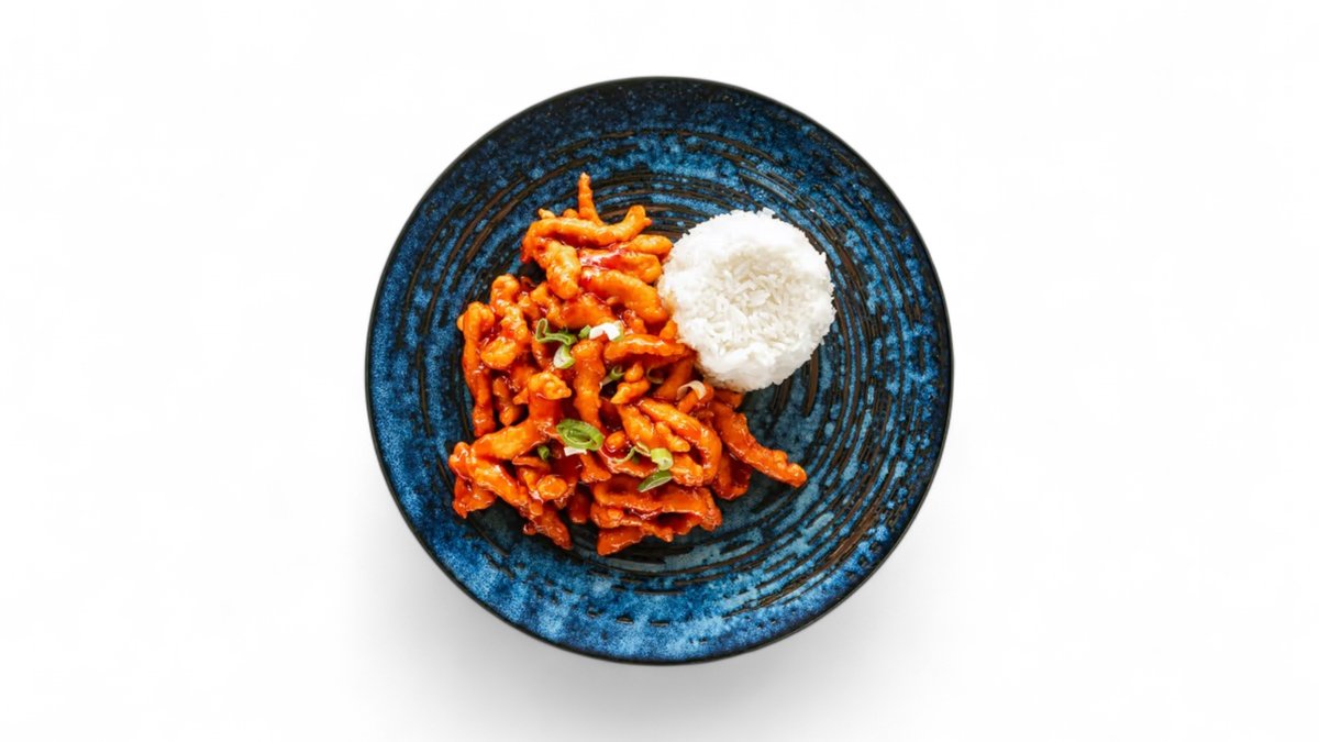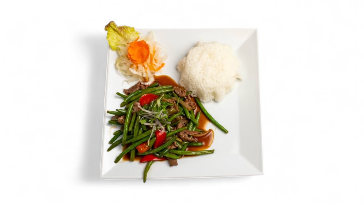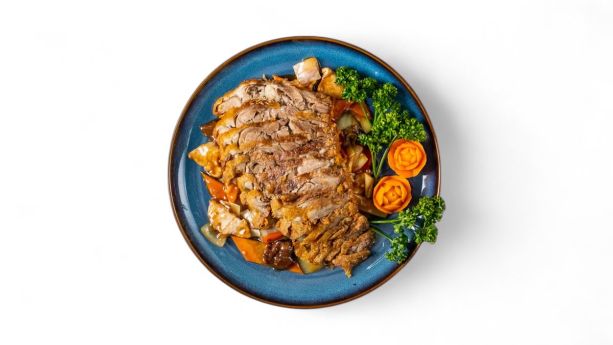 Kachní maso restované s čerstvou zeleninou v jemné asijské omáčce, podávané s rýží. Lehký a chutný pokrm s vyváženou vůní a barvou. (6.9)