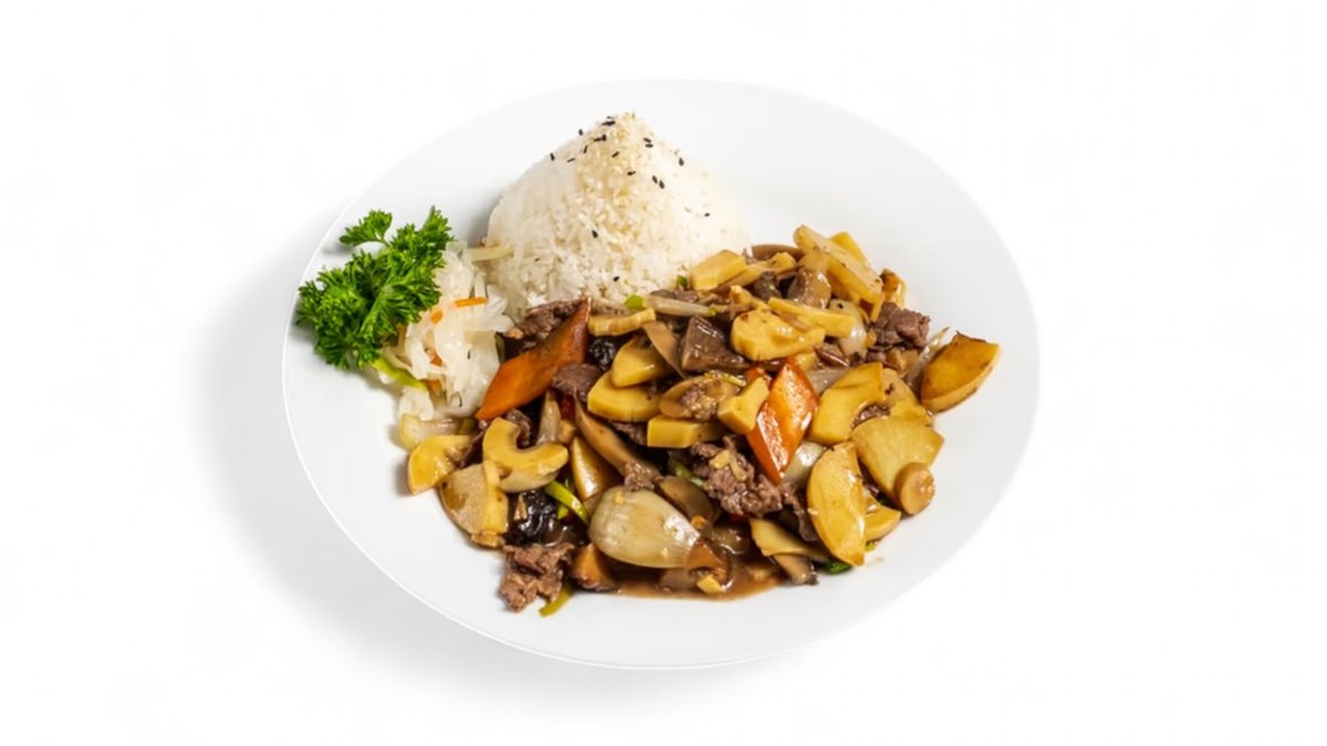 Kachní maso s bambusem a houbami v aromatické asijské omáčce, podávané s vařenou rýži. Kombinace jemného masa a výrazné chuti hub a mangu. (6.9)