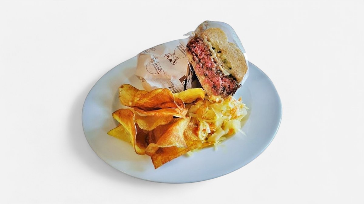 Hamburker s bramborovými lupínky a zelným salátem