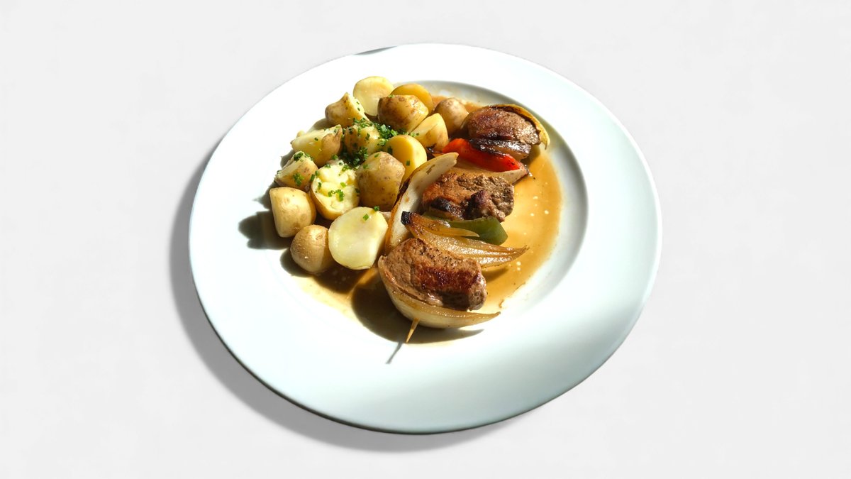 Ražniči z vepřové panenky se slaninou a vařenými bramborami