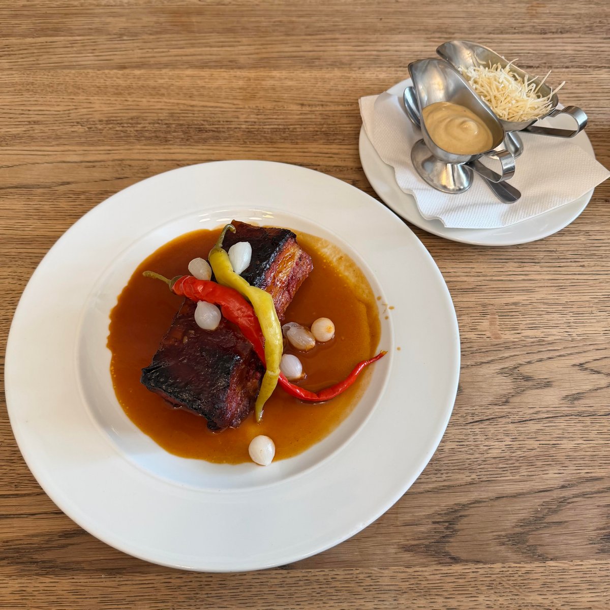Pečená vepřová žebra na pivu s hořčicí a čerstvým křenem, chléb z Esky