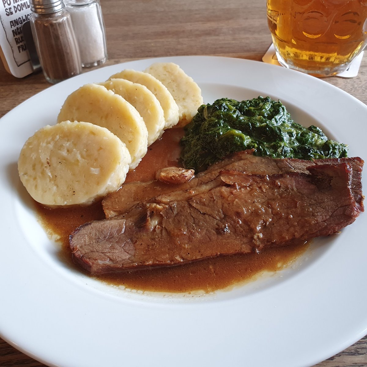 Hovězí hrudí na česneku, špenát, 100 g, bramborové knedlíky