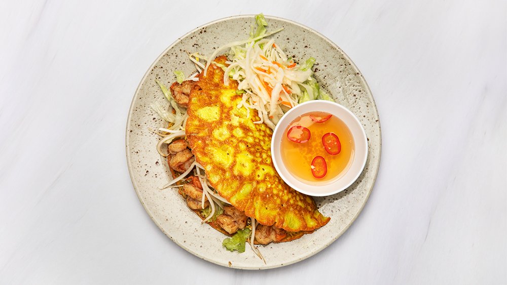 křupavá kurkumo-kokosová palačinka plněná krevetami, vepřovým a mungo klíčky, podávaná se sladkokyselou omáčkou 2,4