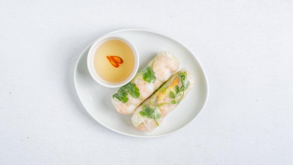 4ks, Čerstvé závitky plněné krevetami, vepřovým masem, bylinkami a rýžovými nudlemi podávané s arašídovou omáčkou 2,3,5,6