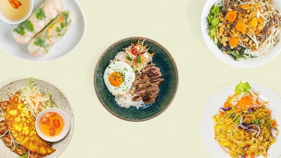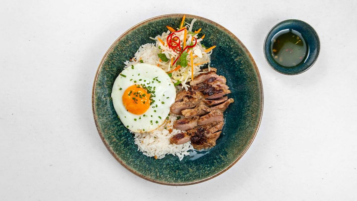 lámaná rýže s grilovaným vepřovým masem, dušená míchaná vejce, vepřová kůže (bì), nakládaná zelenina a sladkokyselá omáčka 3,4,6,7,14