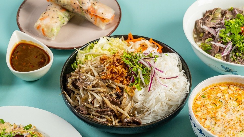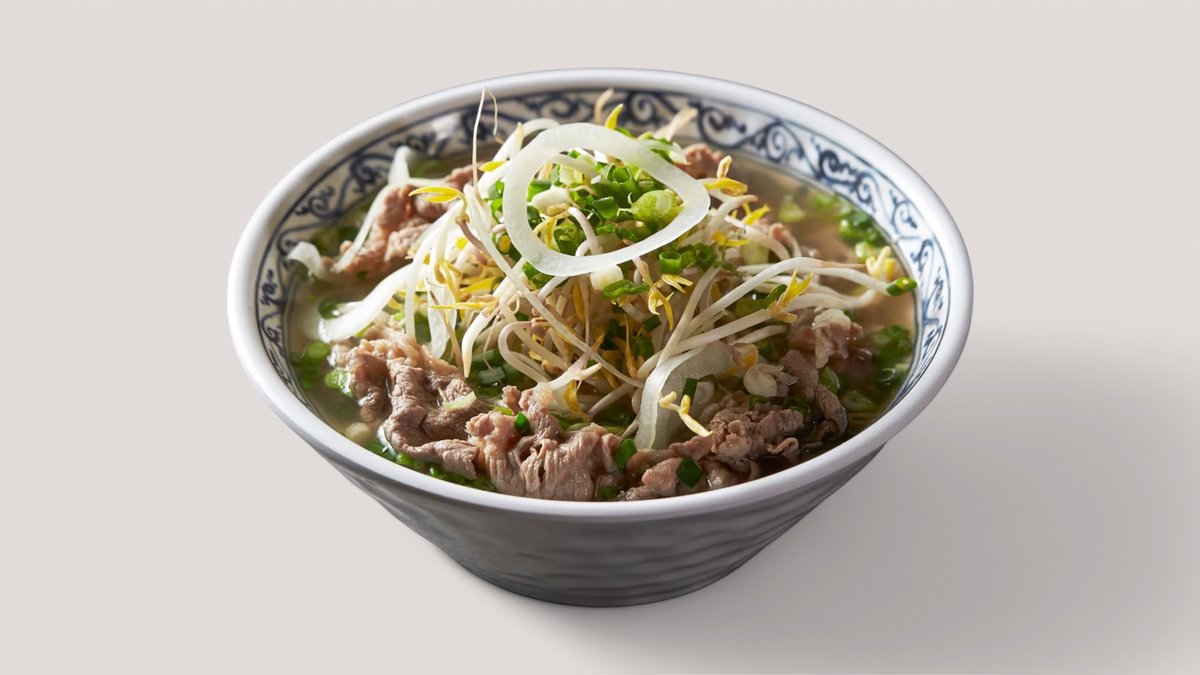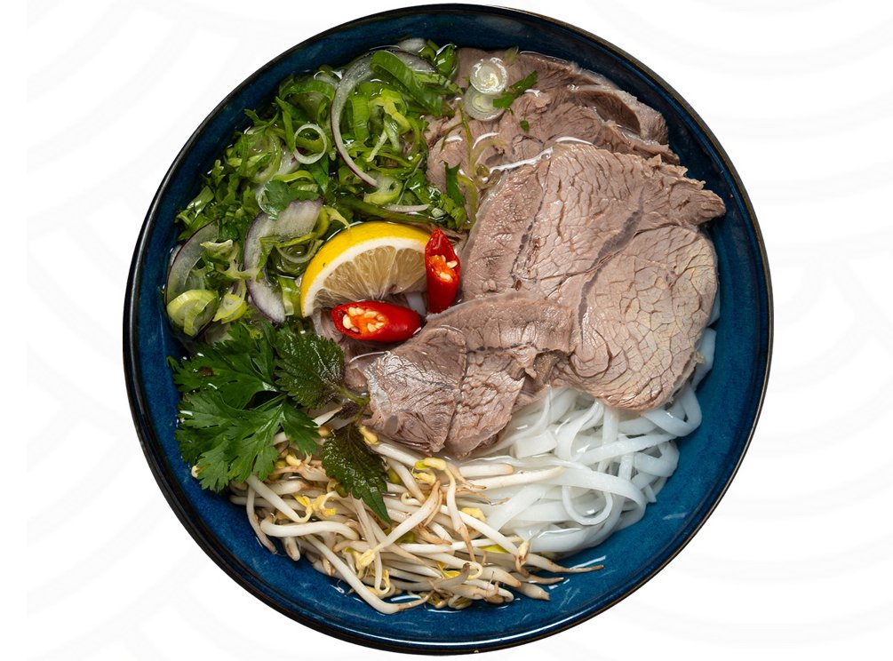 8h tažený poctivý hovězí vývar, hovězí maso, ploché rýžové nudle, čerstvé bylinky, mungo klíčky, nakládaný česnek, citron, chilli papričky