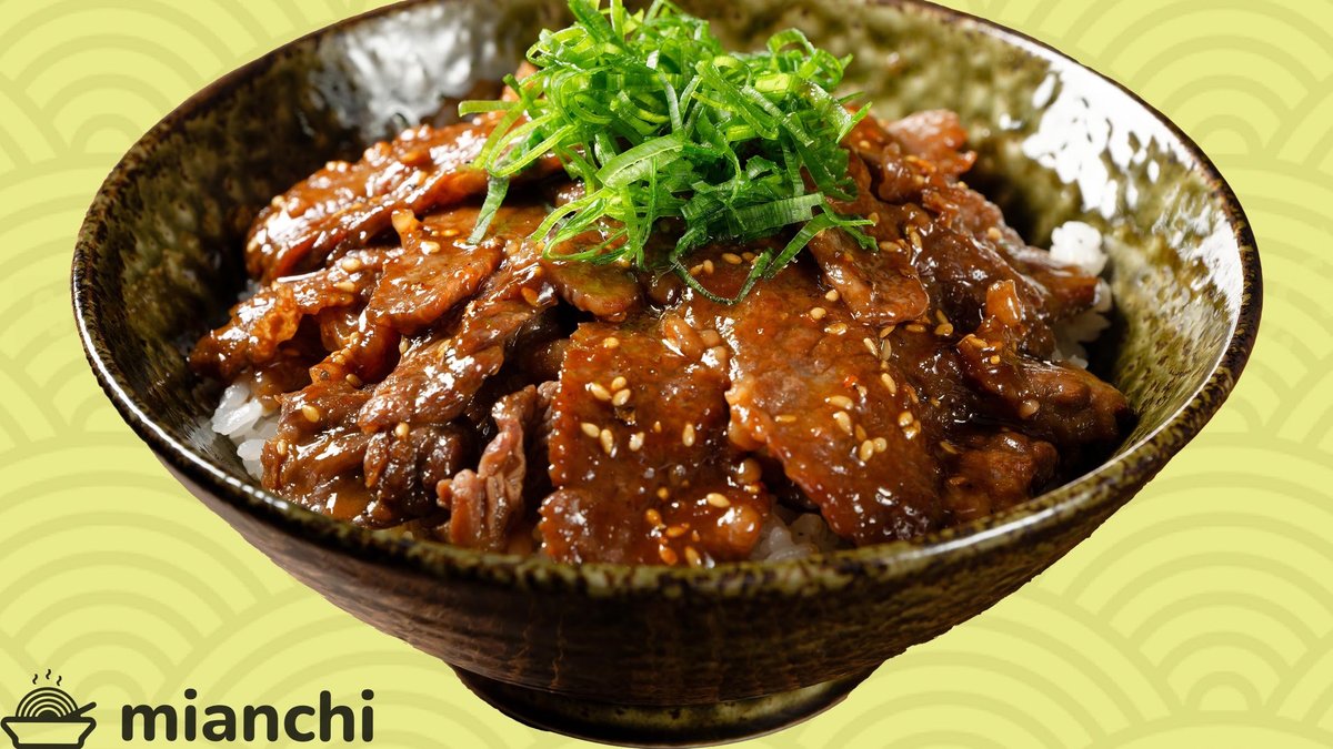 restované hovězí maso, japonská červená sójovka, cibule, rýže