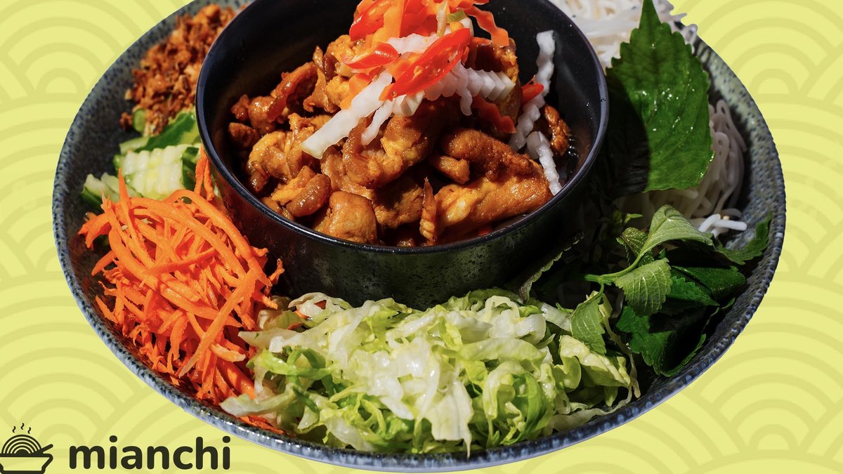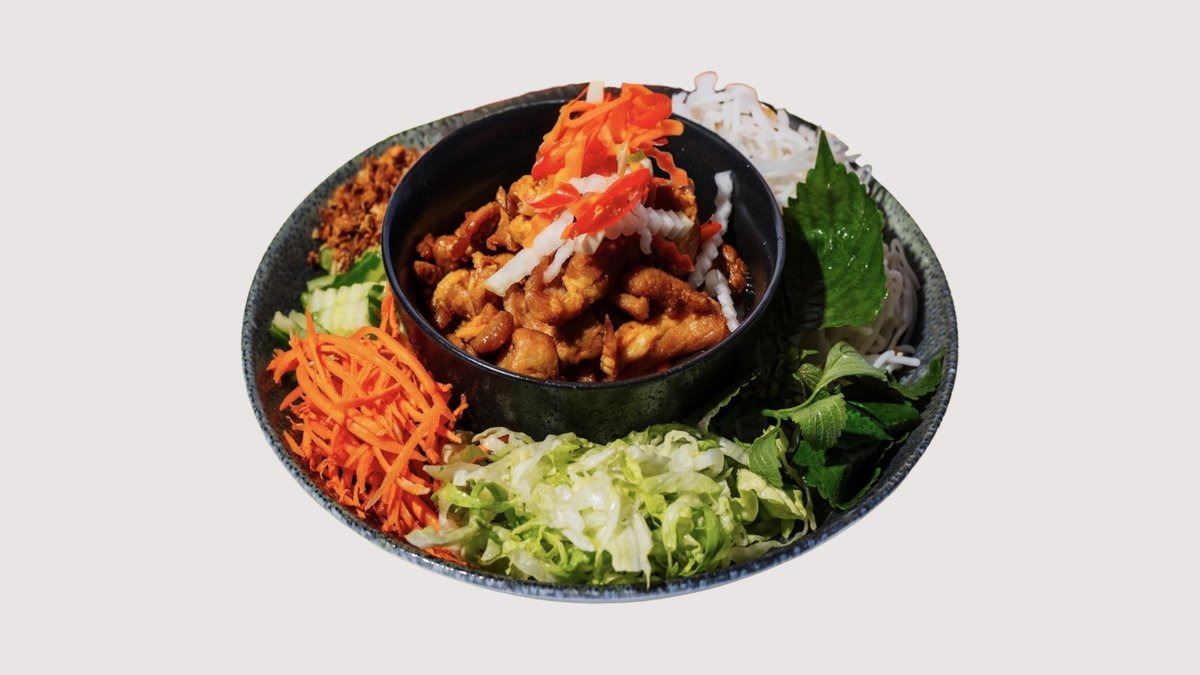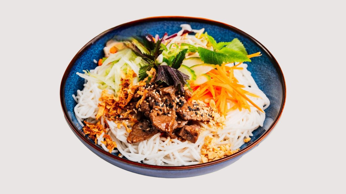 grilované vepřové maso marinované v citronové trávě, medu a galangalu, rýžové nudle, bylinky, sladkokyselá zálivka, čerstvý salát