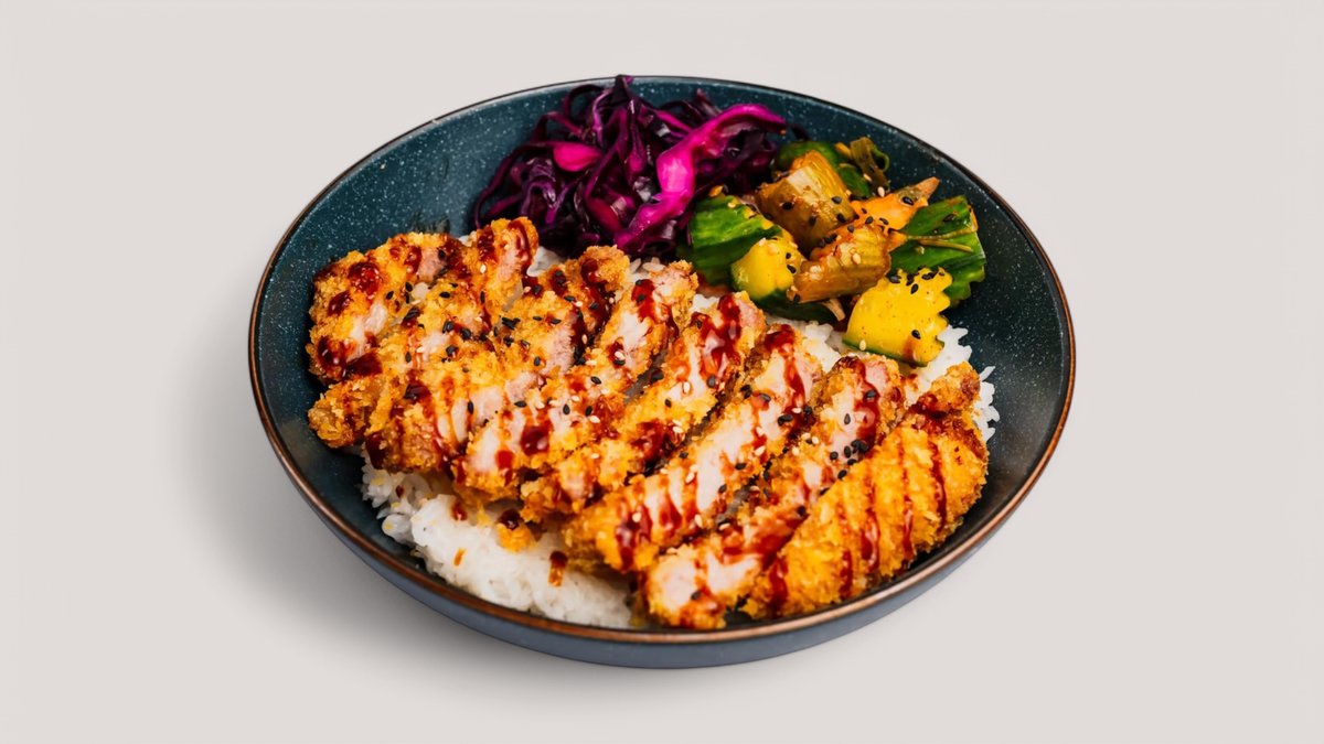 Japonský kuřecí řízek obalovaný v Panko strouhance. Tonkatsu sladkokyselá omáčka. Majonéza. Rýže. Nakládaná zelenina.
