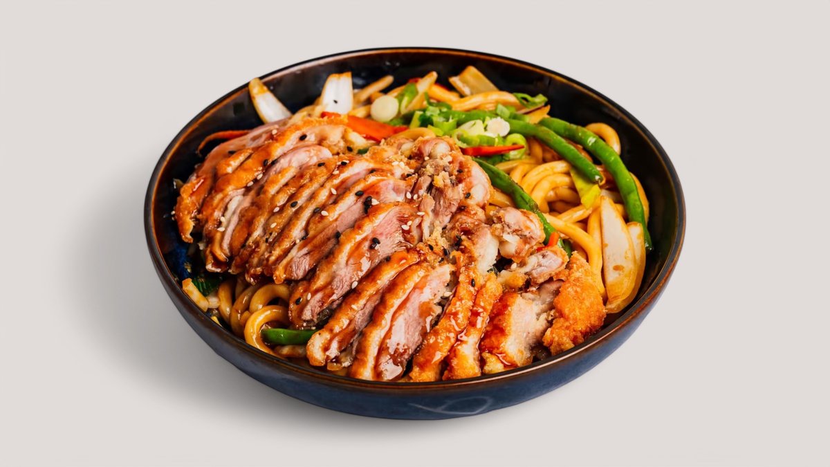 křupavá kachní stehno, medová Teriyaki omáčka, restované Udon nudle, zelenina, smažená cibulka