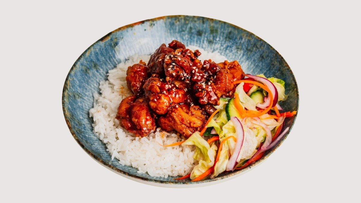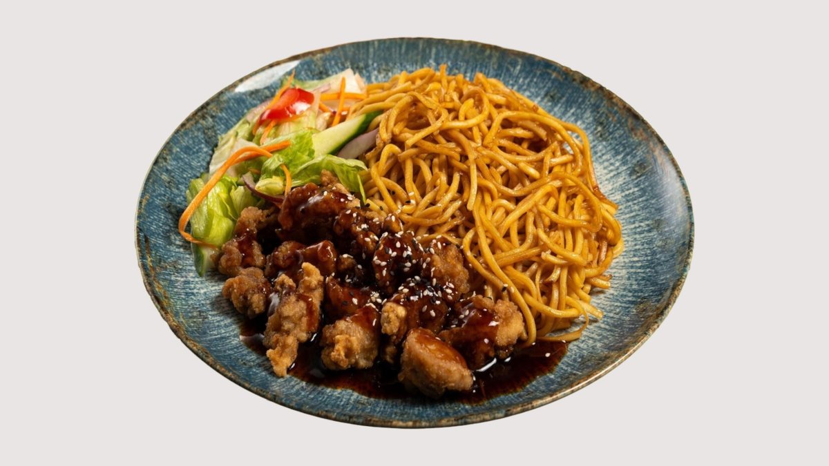 ručně obalované kuřecí kousky s medovou omáčkou Teriyaki, rýže / nudle a čerstvým salátem