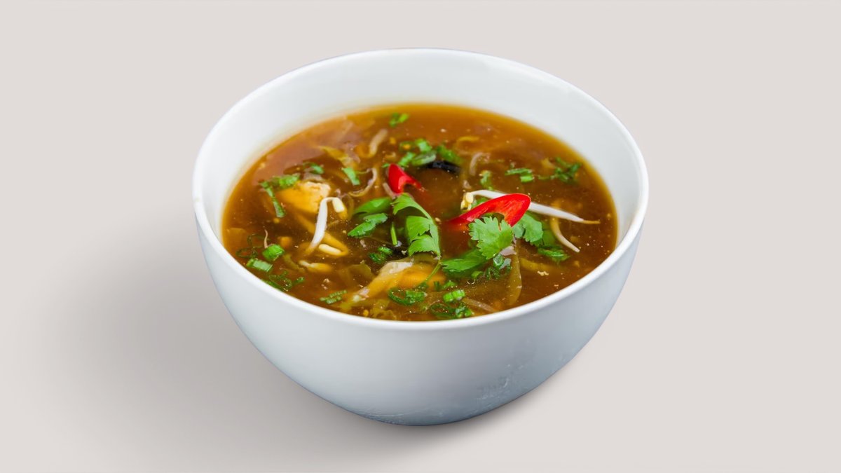 Sladkopikantní rajčatová polévka, jidášovo ucho, bambus, kuřecí maso, čerstvá cibulka