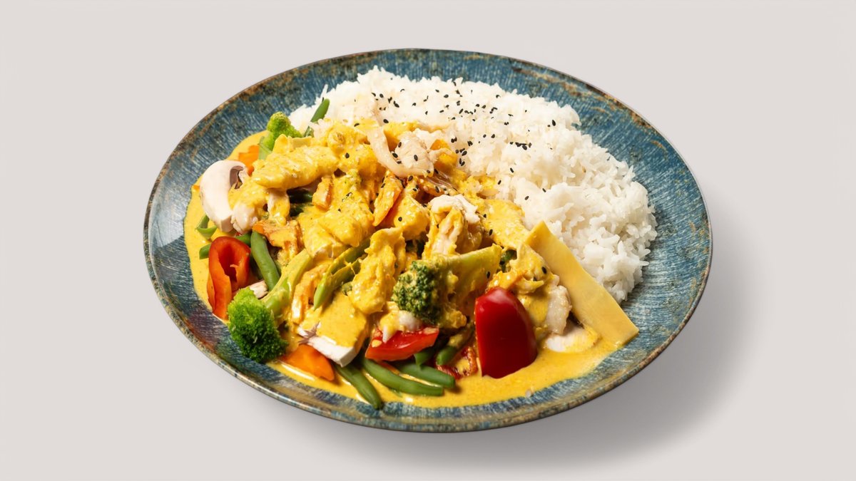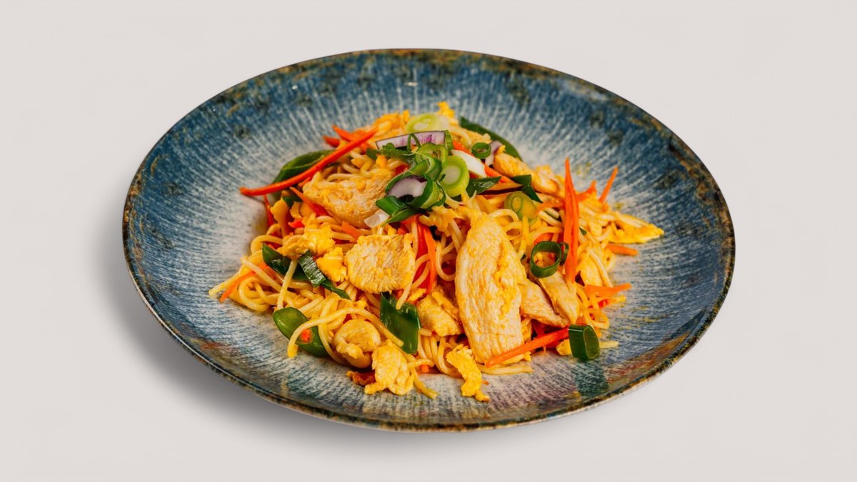 Vaječné restované nudle s kari omáčkou, zeleninou a kuřecím masem