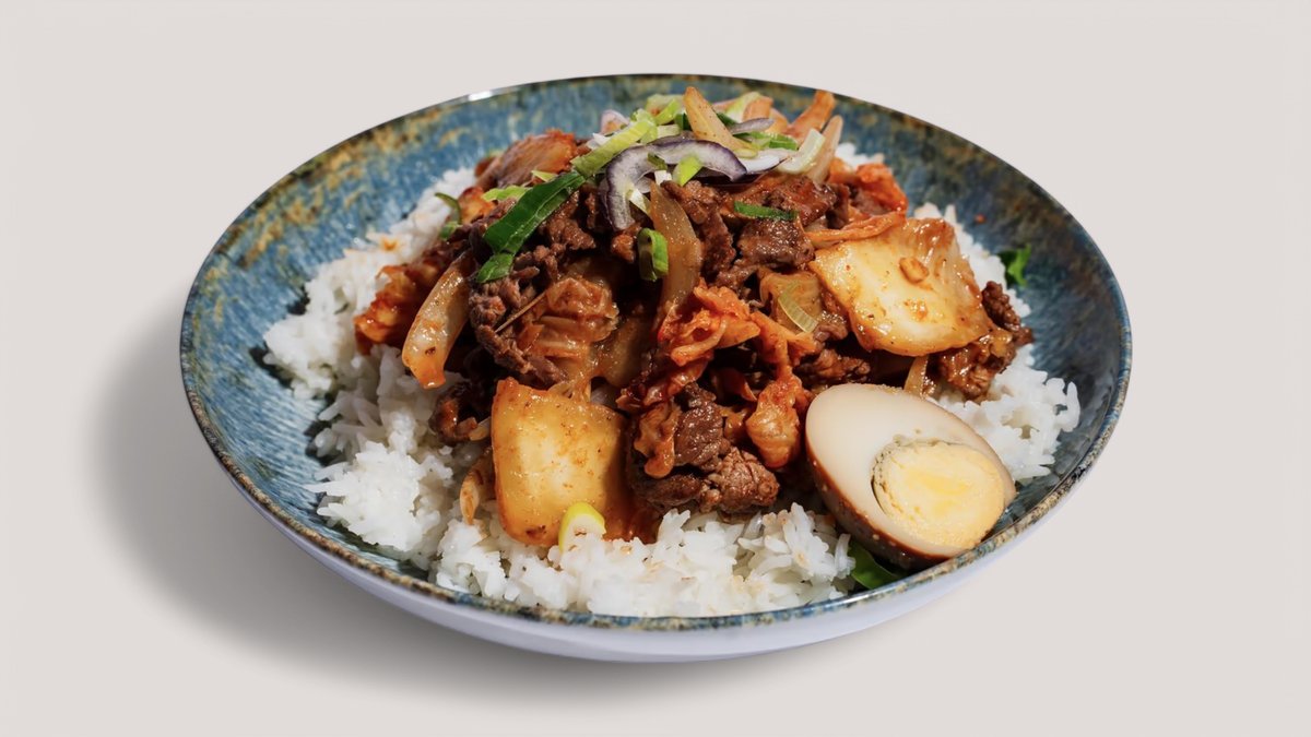 Prudce orestované hovězí maso na silném ohni. Sladko pikantní japonská omáčka. Kampotský pepř. Hořčice semínka. Rýže. Čerstvá cibule. Vejce.