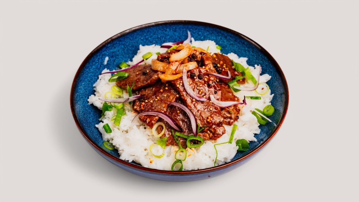 prudce orestované hovězí maso, medová japonská omáčka Teriyaki, rýže, čerstvá cibule, karpatský pepř Pepper.field