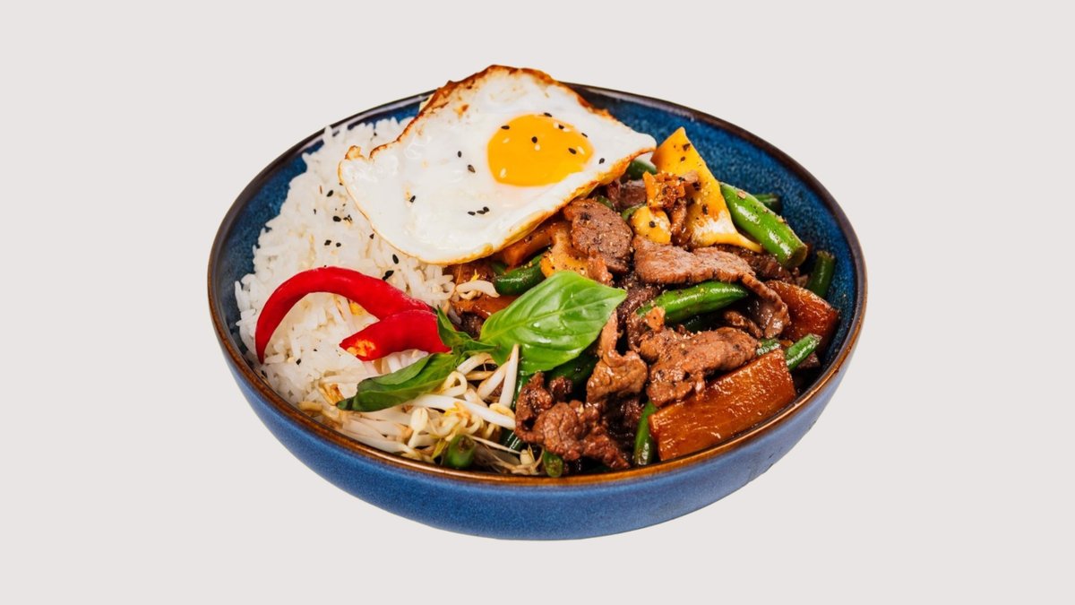 Thajské hovězí soté. Thajská bazalka. Vejce. Kampotský pepř. Pikantní/nepikantní sójová omáčka. Rýže. Zelenina.