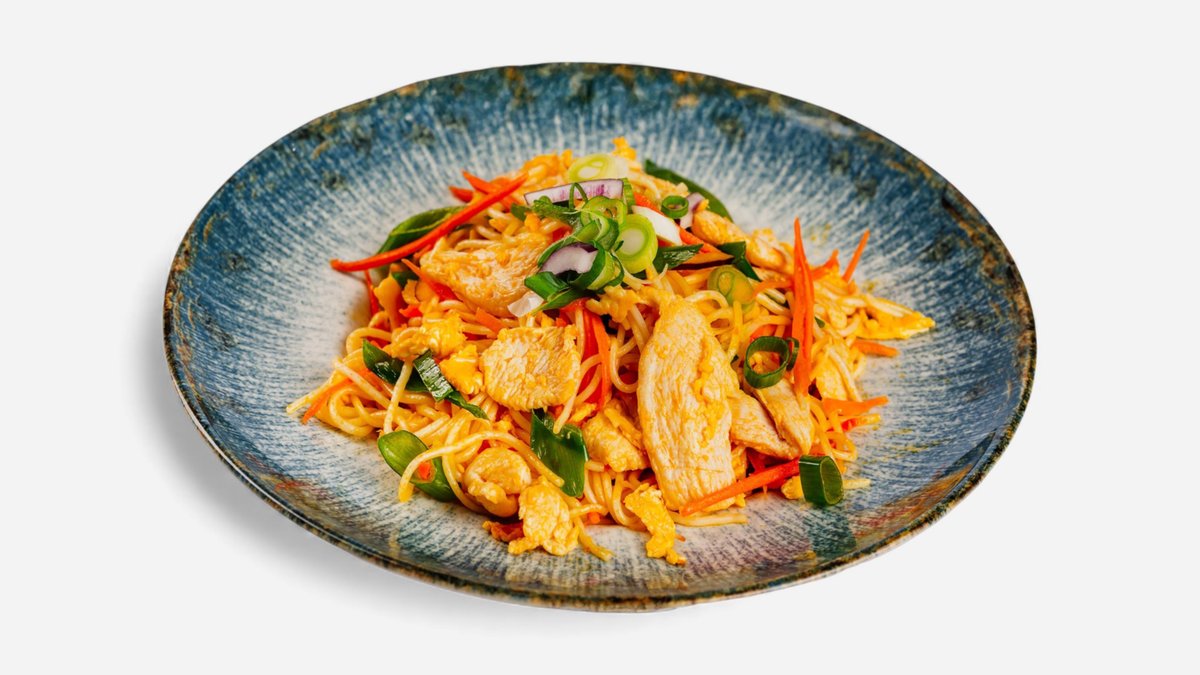 Smažené rýžové nudle s nádechem kari a s kuřecím masem, zeleninou, smažená cibulka