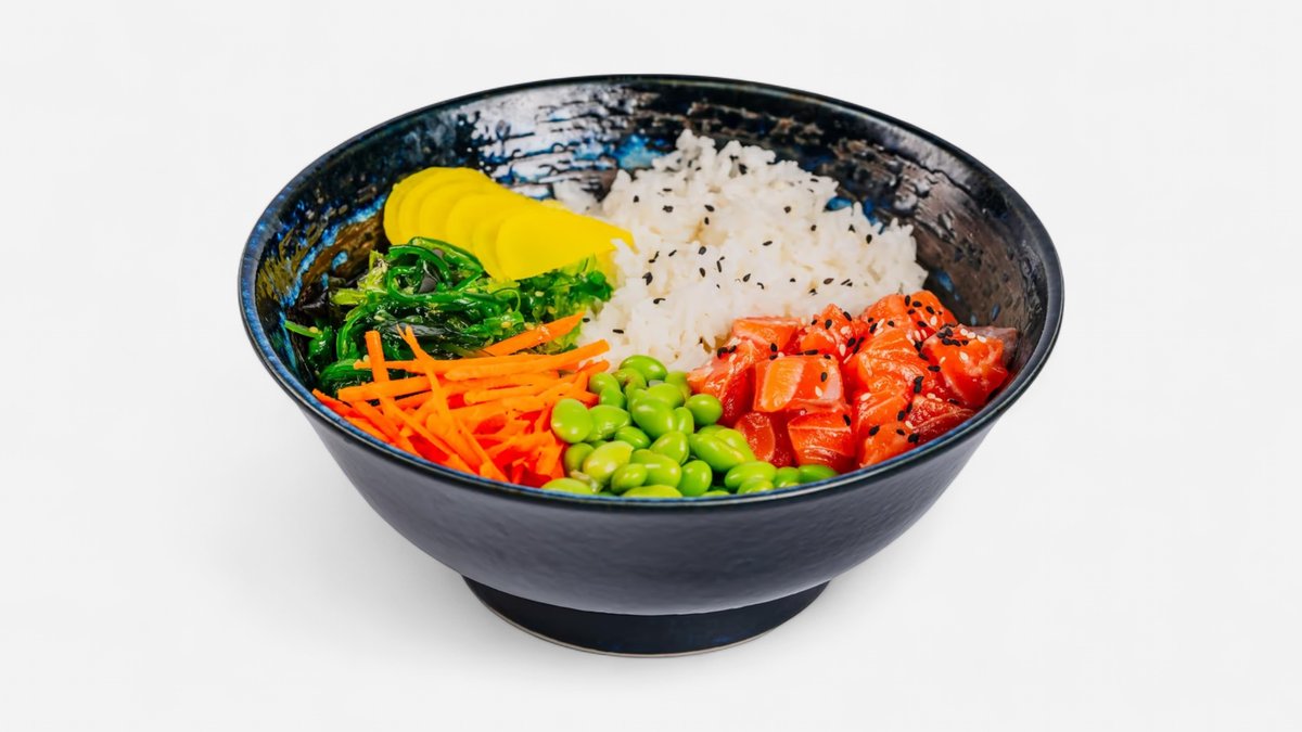 Rýže jako základ, čerstvý losos, sezonní zelenina, nakládaná zelenina, chilli majonéza.