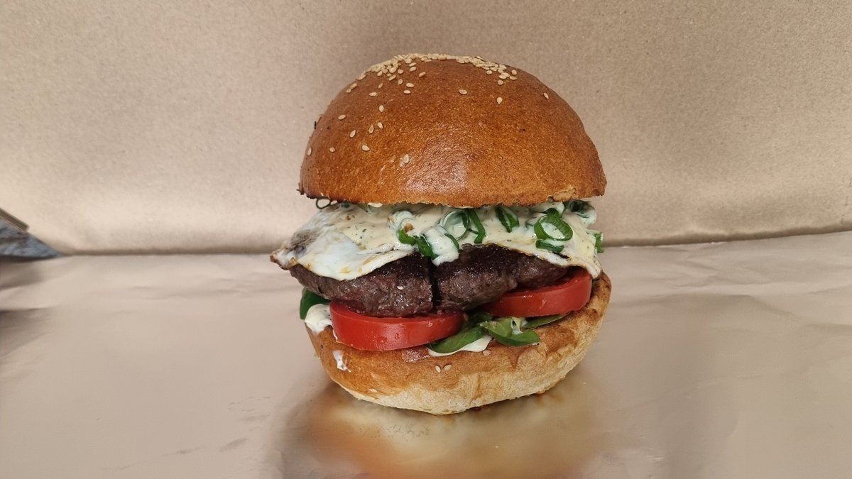 sezamová bulka, ledový salát, rajče, hovězí maso 100g, cheddar, slanina, karamelizovaná cibulka, sázené vejce, BBQ omáčka, tatarská omáčka