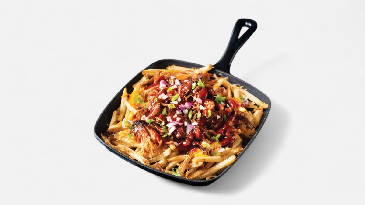 steakové hranolky zapečené sýrem cheddar, slanina, restovaná cibule, jarní cibulka