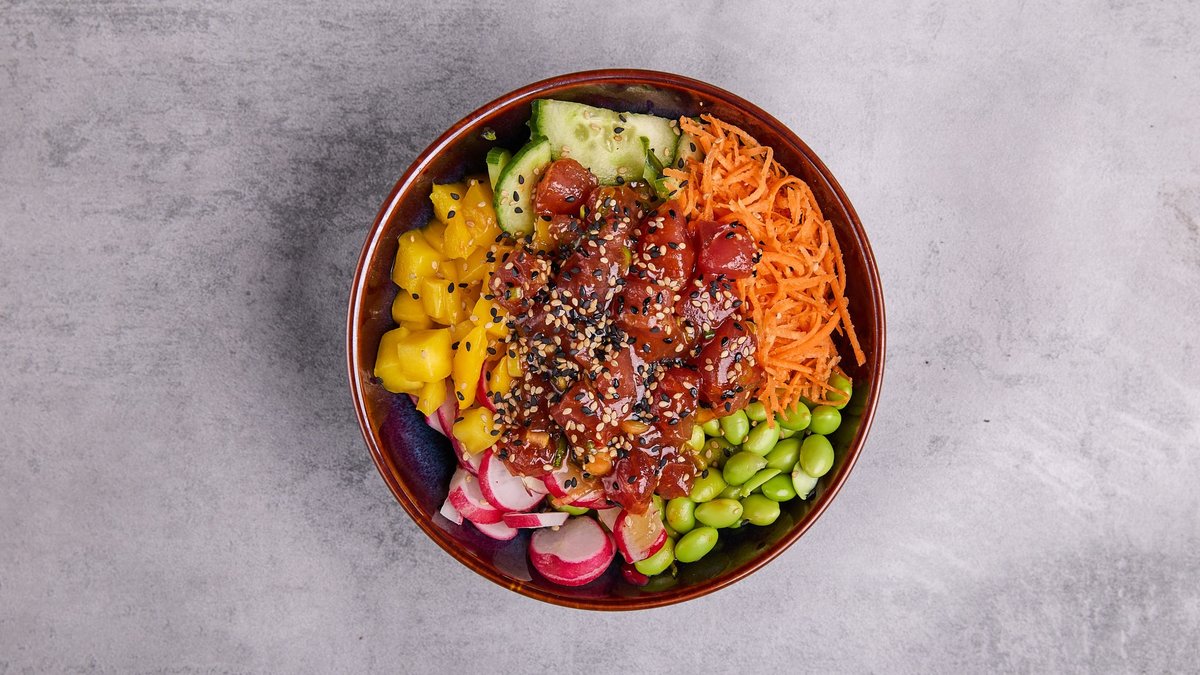 Žlutoploutvý tuňák Mango, okurka, ředkvička, edamame, korejská mrkev, sezam a jarní cibulka Domácí sweet chilli jogurtová majonéza a shoyu sójové omáčka.