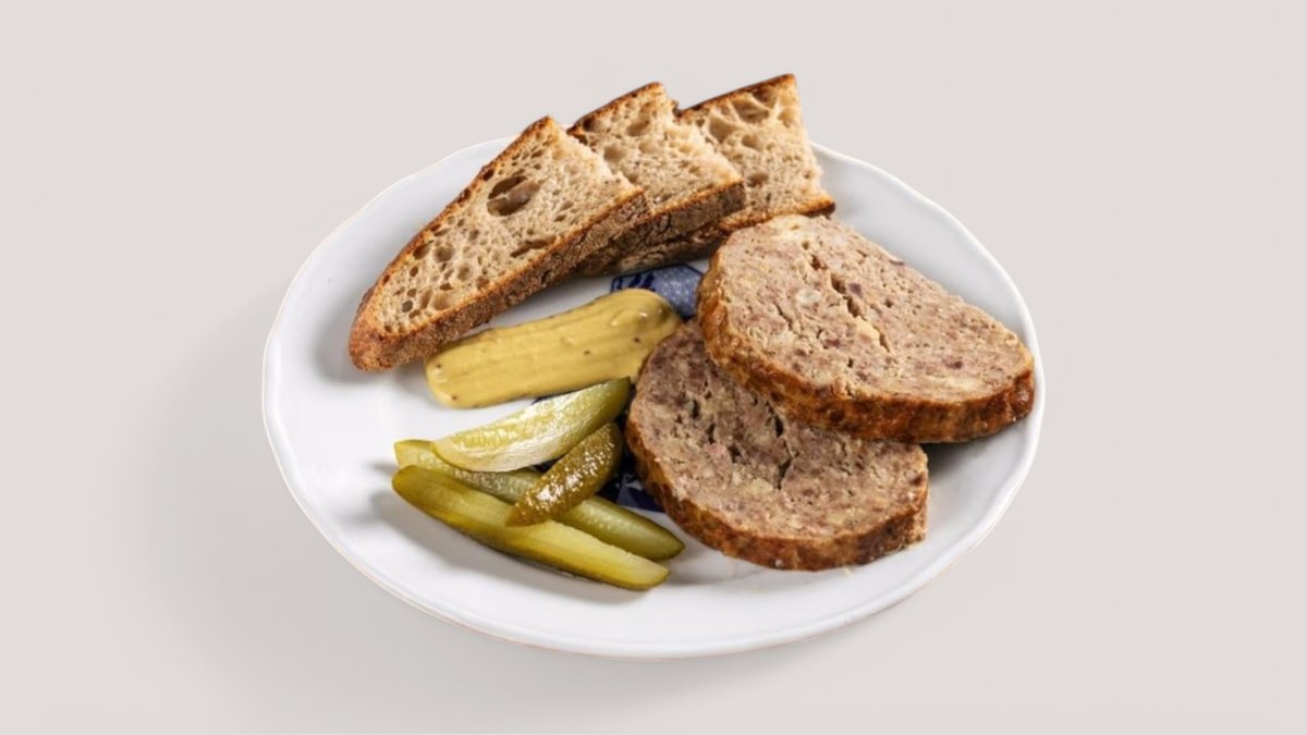 naše sekaná a hořčice, kyselá okurka, na výběr v housce nebo v chlebu
