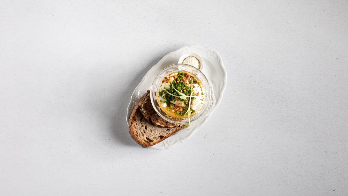 sázeným vejcem, pečená cherry rajčata, bylinkový olej + 4 ks pečiva, cena včetně obalů