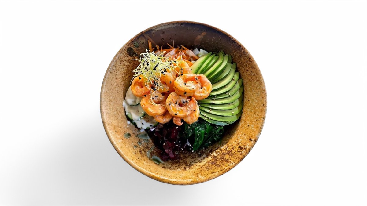 sushi rice, steamed prawn in spicy mayo , avocado, iceberg salad, cucumber, carrot, beetroot, Wakame, sesame, Ponzu and Coconut milk sauce