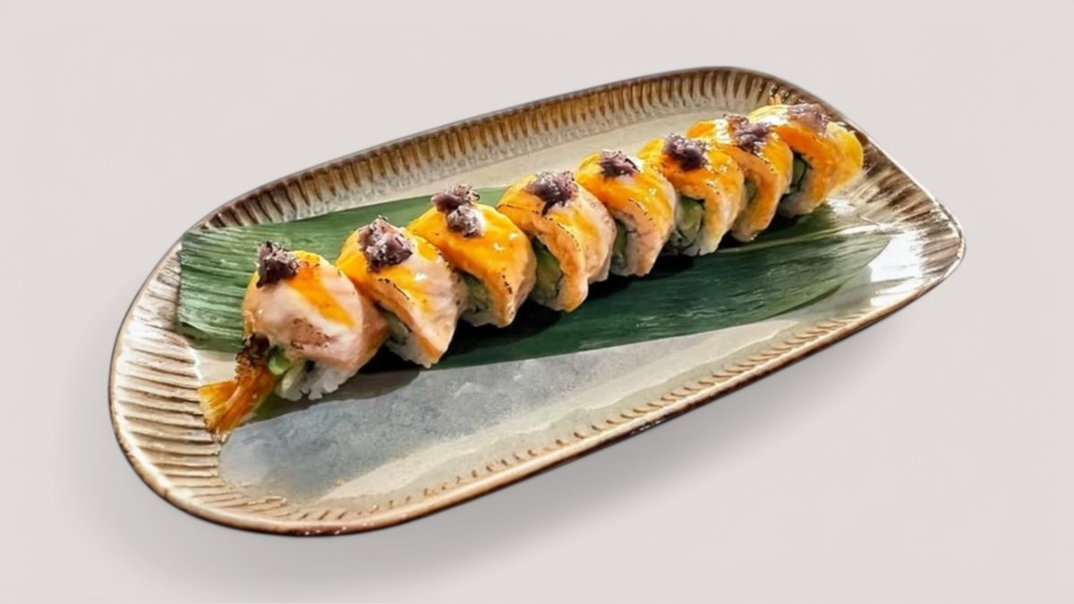IN: tempura prawn, avocado, cucumber OUT: flamed salmon, Coconut milk and Spicymayo sauce,caramelize onion