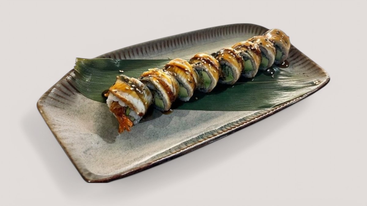 IN: tempura prawn, avocado, cucumber OUT: grilled ee, Teriyaki sauce, sesame