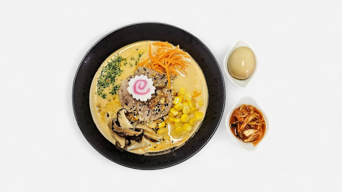 Ramen noodle soup, sesame & soy bean sauce, marinated chicken, Shitake mushroom, carrot, onion, bean sprouts, sweet corn, egg, served with Kimchi