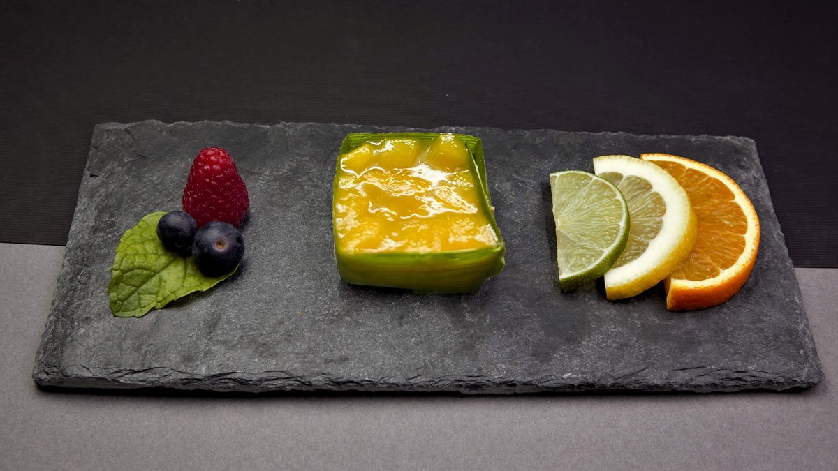 🥭 mango na kostičky 🍚 sladká rýže 🍃 košíček z palmového listu (nejedlá část)