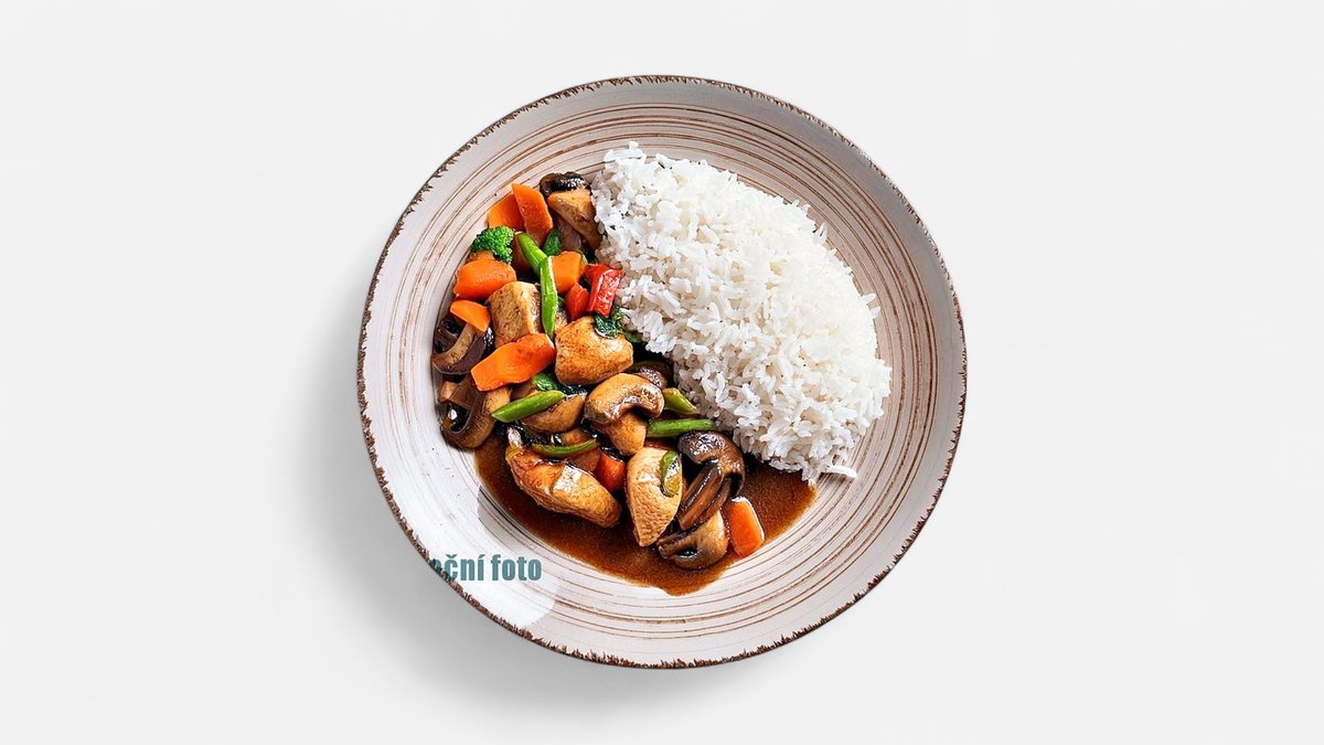houby, mrkev, hrášek, čínské zelí, cibule, bambusové výhonky