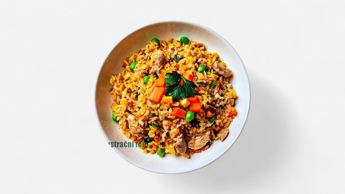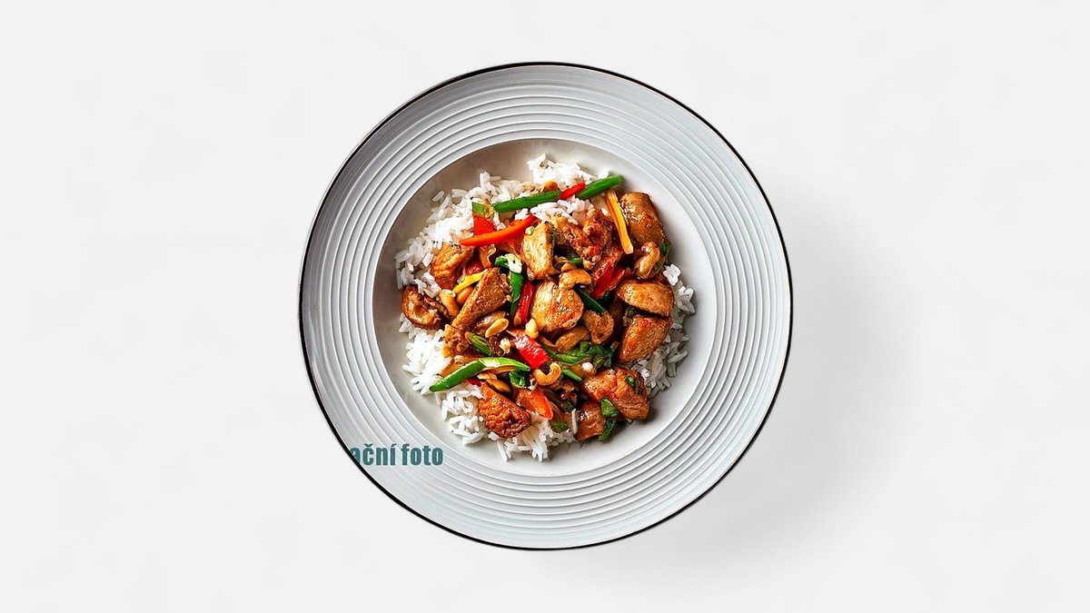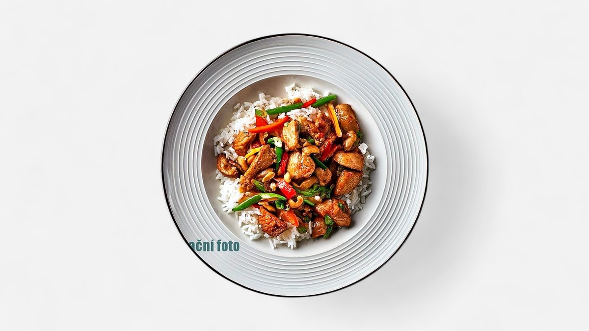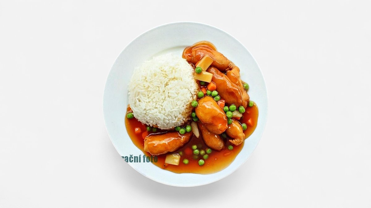obalované kuře, ananas, mrkev, hrášek, paprika