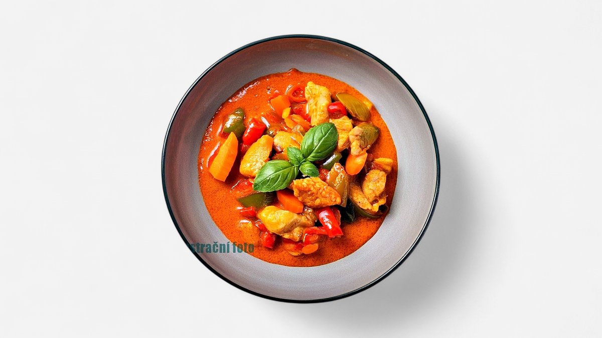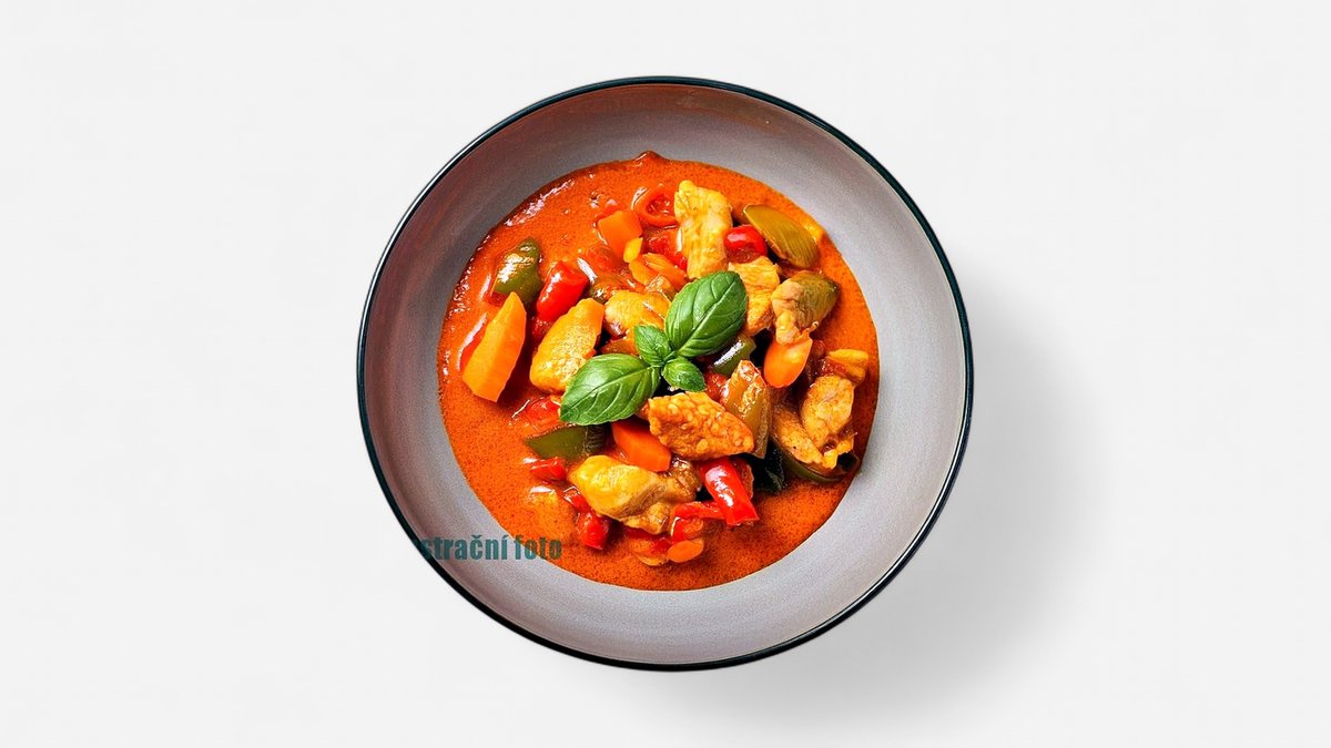 slanopálivá příchuť s červeným kari, kokosové mléko, čínské zelí, cibule, papriky, bambusové výhonky, mrkev