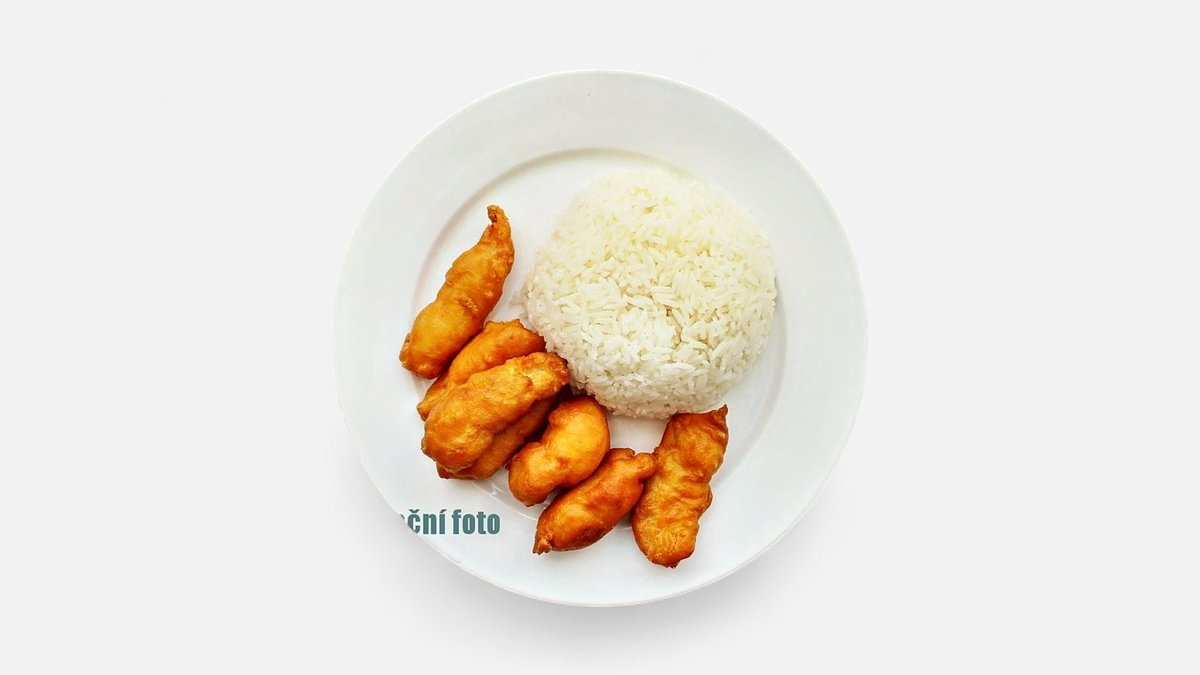 obalovaná kachna, ananas, mrkev, hrášek, paprika