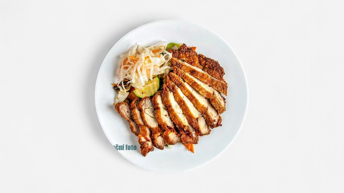 obalovaná kachna s česnekovou pálivou omáčkou s nakládaným salátem