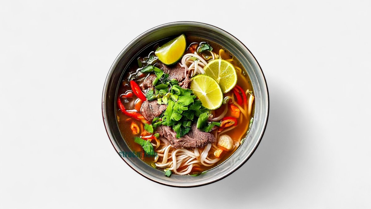 hovězí nudlová polévka, cibule, pórek, klíčky, koriandr, citron, nakládaný česnek