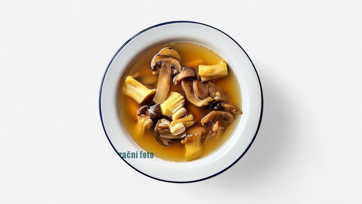 vegetariánská nudlová polévka, cibule, pórek, klíčky, koriandr, citron, nakládaný česnek