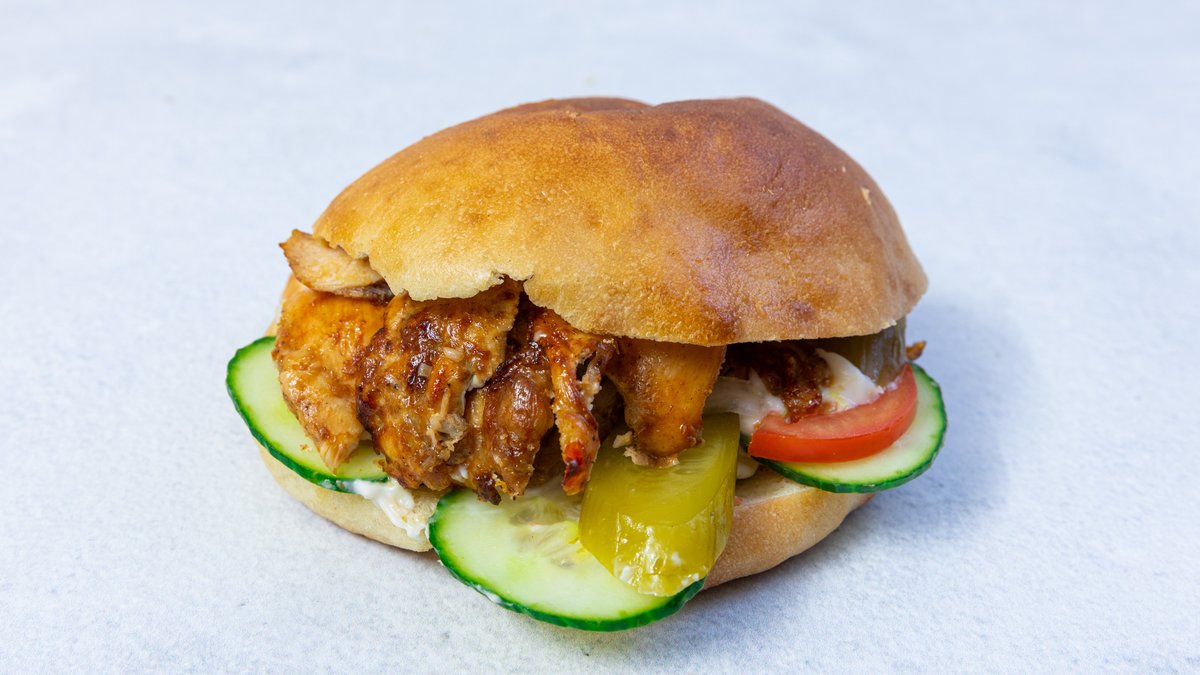 shawarma kuřecí maso, dresing, nakládané okurky, na výběr hranolky / chléb