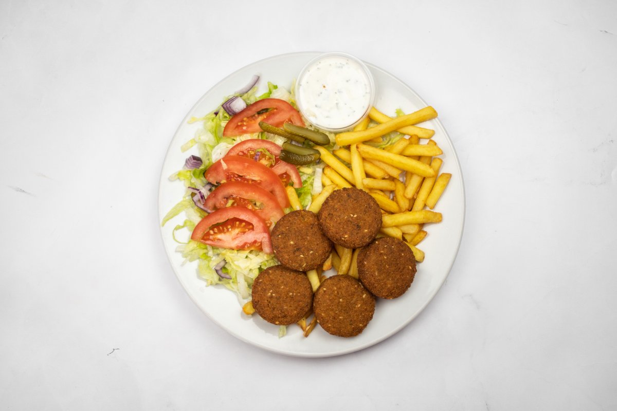 5 ks falafel, hummus, pita chleba, nakládané okurky, dresing