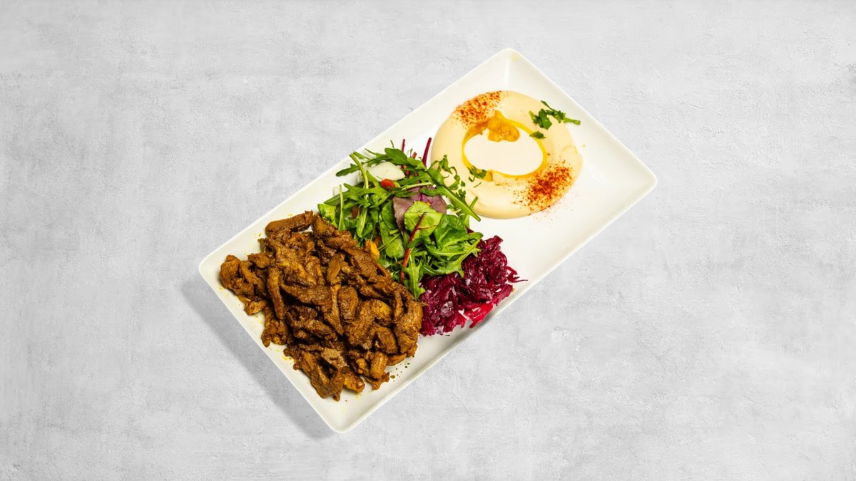 Sójová shawarma, salát, hummus + domácí pita chléb (1,6,8,11,12)