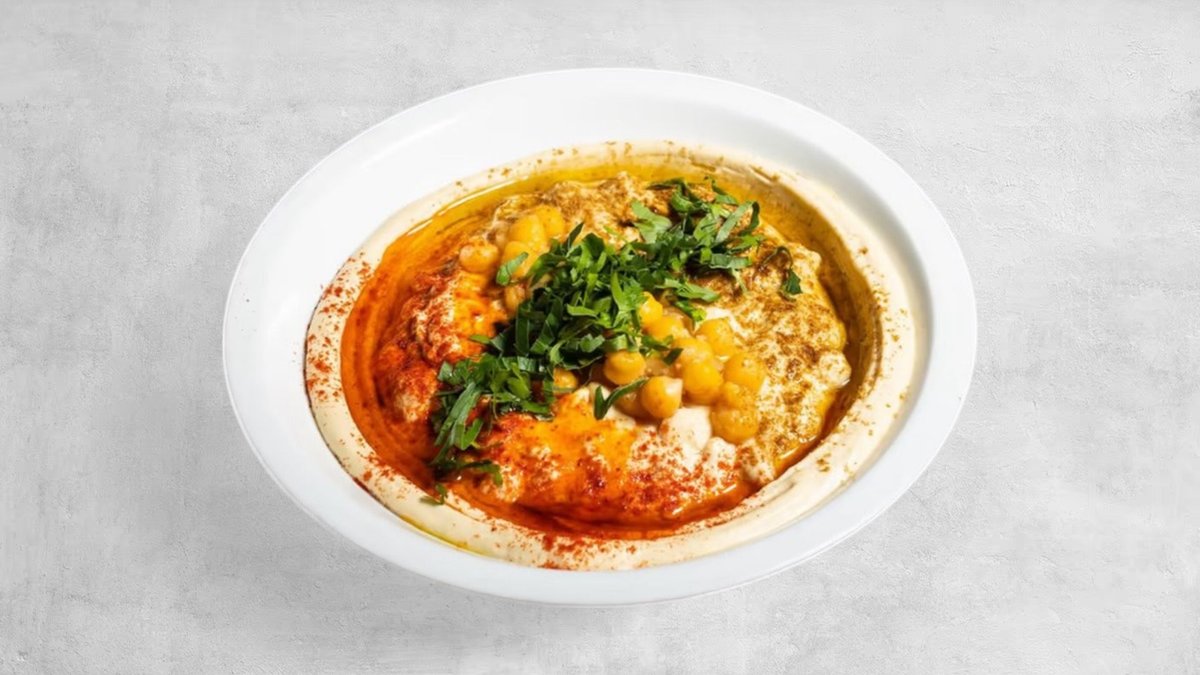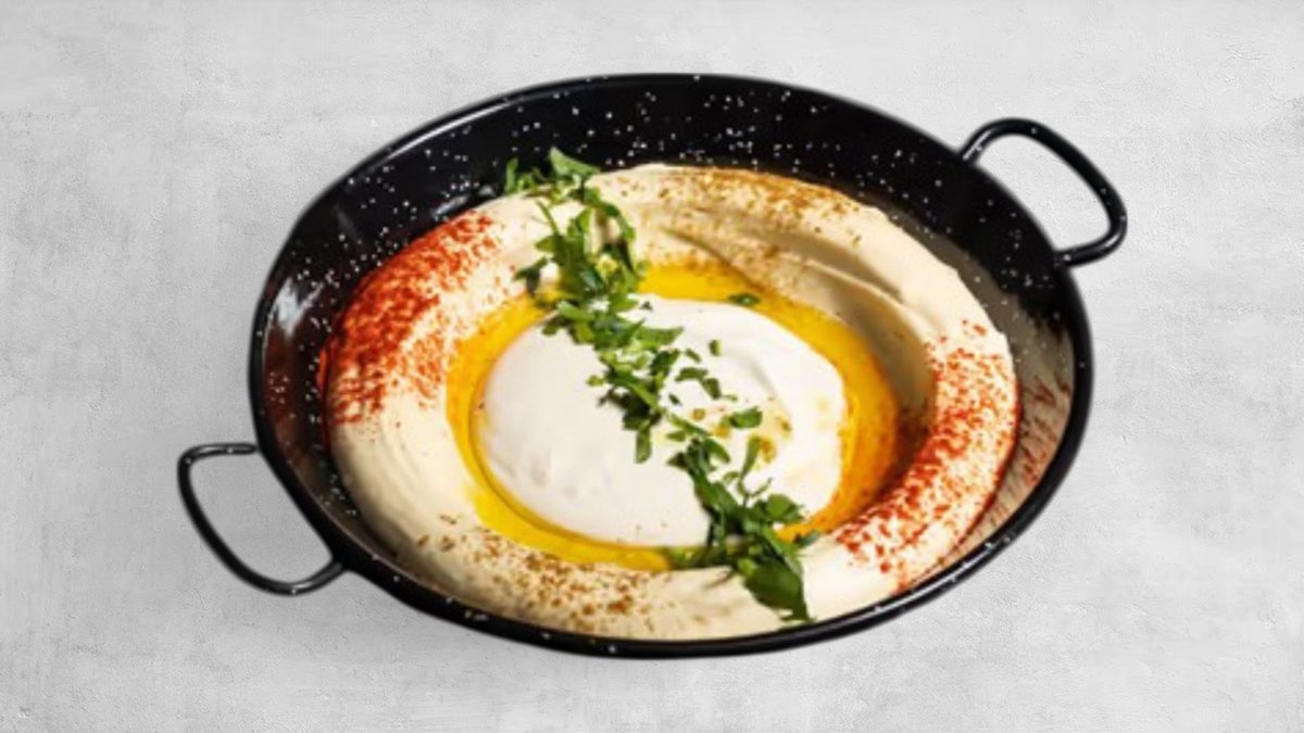 our creamy hummus with 3 homemade lamb merguez served with pita bread