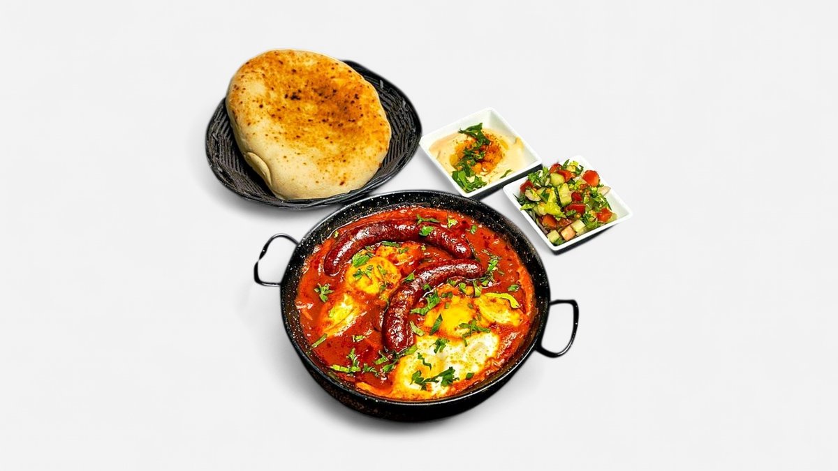 fried eggplant , balkan cheese , 2 eggs , all inside our homemade tomato sauce , served with pita bread small salad and tahini (1,3,11,12)
