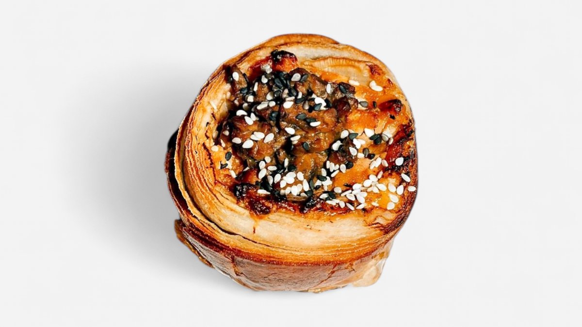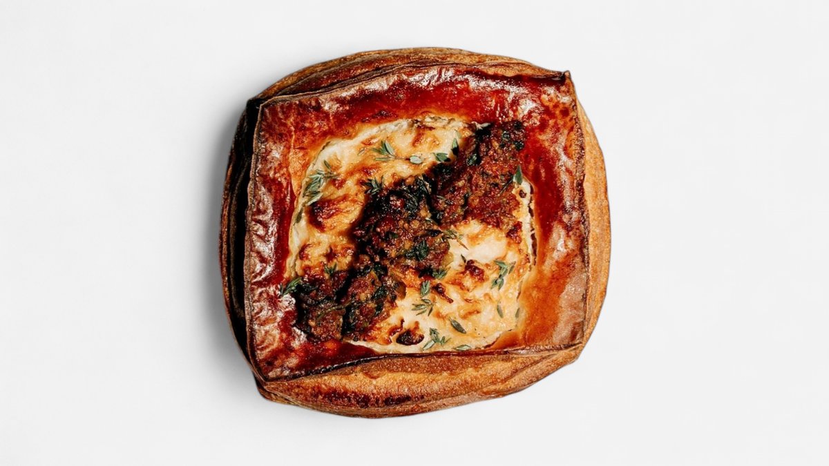 🥐 těsto ve formě košíčku, plněno tofu-čedarovým krémem a dýní pečenou s tymiánem a cibulí