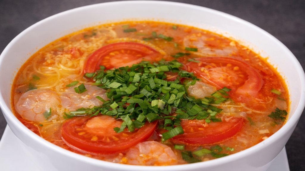 polevka tomyum krevety, rýžové nudle, maso, koriandr, cibule, rajčata,