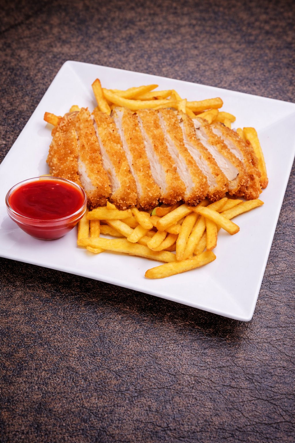 krevety tempura s hranolkami, podávaná s kečupem nebo tatarskou omáčkou