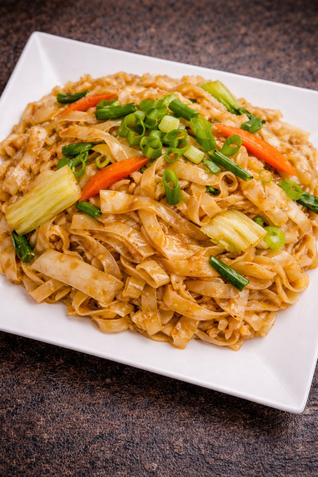 smažené široké kureci nudle, zelenina mrkev, maso dle výběru